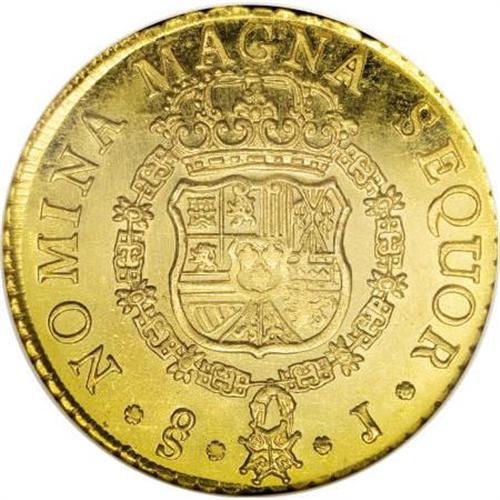 <B>Ferdinand VI gold 8 Escudos 1751J,</B></I> KM3, MS63 NGC, a superb example with full glowing mint brilliance, sharp details and virtually pristine surfaces. Just an incredible example of this early colonial Santiago coinage and a prize for the ultra quality-conscious collector. <BR><BR><b>Shipping:</b> Coins & Currency (<a target="_blank" href="http://www.heritageauctions.com/common/shipping.php">view shipping information</a>)