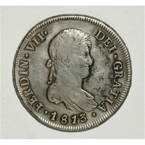 <B>Ferdinand VII 8 Reales 1813-FJ,</B></I> KM80, nearly VF, slightly porous surfaces with some superficial patination in the right obverse field.<BR><BR><b>Shipping:</b> Coins & Currency (<a target="_blank" href="http://www.heritageauctions.com/common/shipping.php">view shipping information</a>)