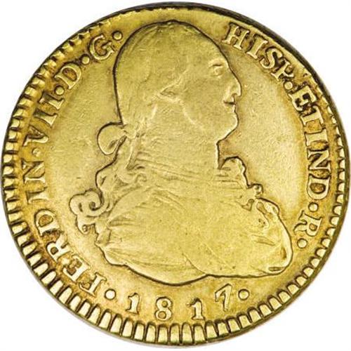 <B>Ferdinand VII gold 2 Escudos 1817-FJ,</B></I> KM81, nice toned VF+, an attractive example with strong design details and no obvious flaws. Very scarce type.<BR><BR><b>Shipping:</b> Coins & Currency (<a target="_blank" href="http://www.heritageauctions.com/common/shipping.php">view shipping information</a>)