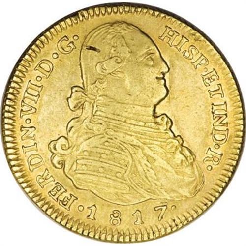 <B>Ferdinand VII gold 4 Escudos 1817-FJ,</B></I> KM77, toned XF, some traces of original luster in the legends, nicely struck design details particularly on the bust of the King. One noticeable planchet flaw on the King's hair.<BR><BR><b>Shipping:</b> Coins & Currency (<a target="_blank" href="http://www.heritageauctions.com/common/shipping.php">view shipping information</a>)
