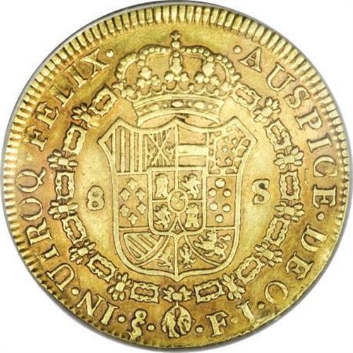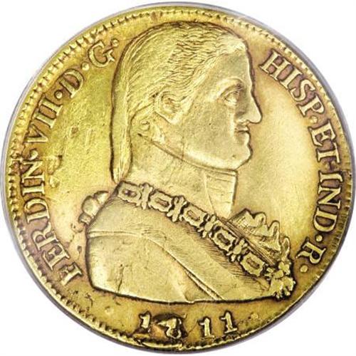 <B>Ferdinand VII gold 8 Escudos 1811-FJ,</B></I> KM72, XF45 PCGS, imaginary military bust, rose gold toning in the legends, evenly worn details with some tiny laminations on the obverse.<BR><BR><b>Shipping:</b> Coins & Currency (<a target="_blank" href="http://www.heritageauctions.com/common/shipping.php">view shipping information</a>)