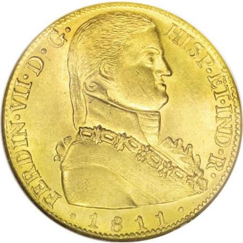 <B>Ferdinand VII gold 8 Escudos 1811-FJ,</B></I> KM72, MS62 NGC, imaginary military bust, a choice example with full mint brilliance and extremely sharp details. The surfaces are exceptionally pristine and the overall impact of this coin is outstanding. We have seen very few truly mint state specimens of this type.<BR><BR><b>Shipping:</b> Coins & Currency (<a target="_blank" href="http://www.heritageauctions.com/common/shipping.php">view shipping information</a>)