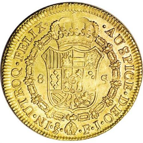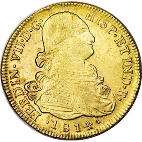 <B>Ferdinand VII gold 8 Escudos 1814-FJ,</B></I> KM78, choice AU-UNC, lightly toned and fully original. The details are unusually sharp on both sides giving this example exceptional eye appeal. Very scarce this nice!<BR><BR><b>Shipping:</b> Coins & Currency (<a target="_blank" href="http://www.heritageauctions.com/common/shipping.php">view shipping information</a>)