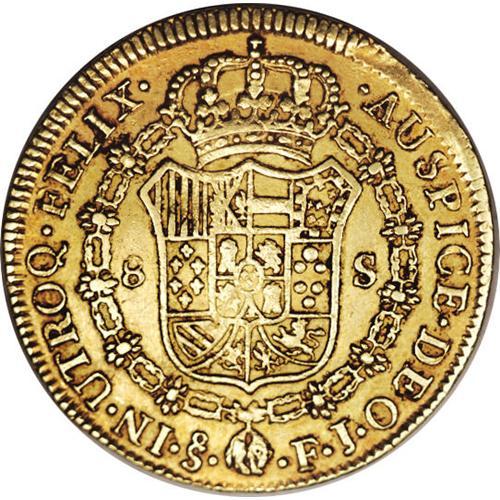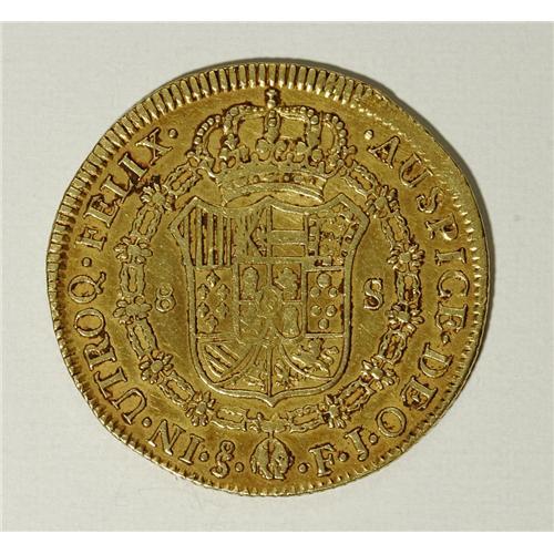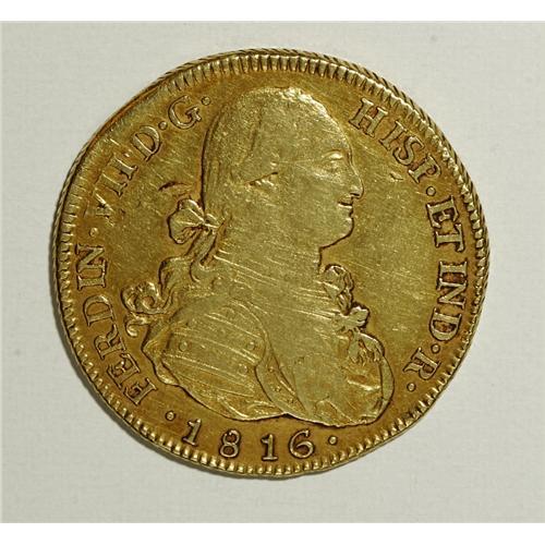 <B>Ferdinand VII gold 8 Escudos 1816-FJ, </B></I>KM78, VF-XF, a nice original coin, small planchet lamination behind the bust of the King and an area along the rim which is weakly struck due to uneven thickness of the flan.<BR><BR><b>Shipping:</b> Coins & Currency (<a target="_blank" href="http://www.heritageauctions.com/common/shipping.php">view shipping information</a>)