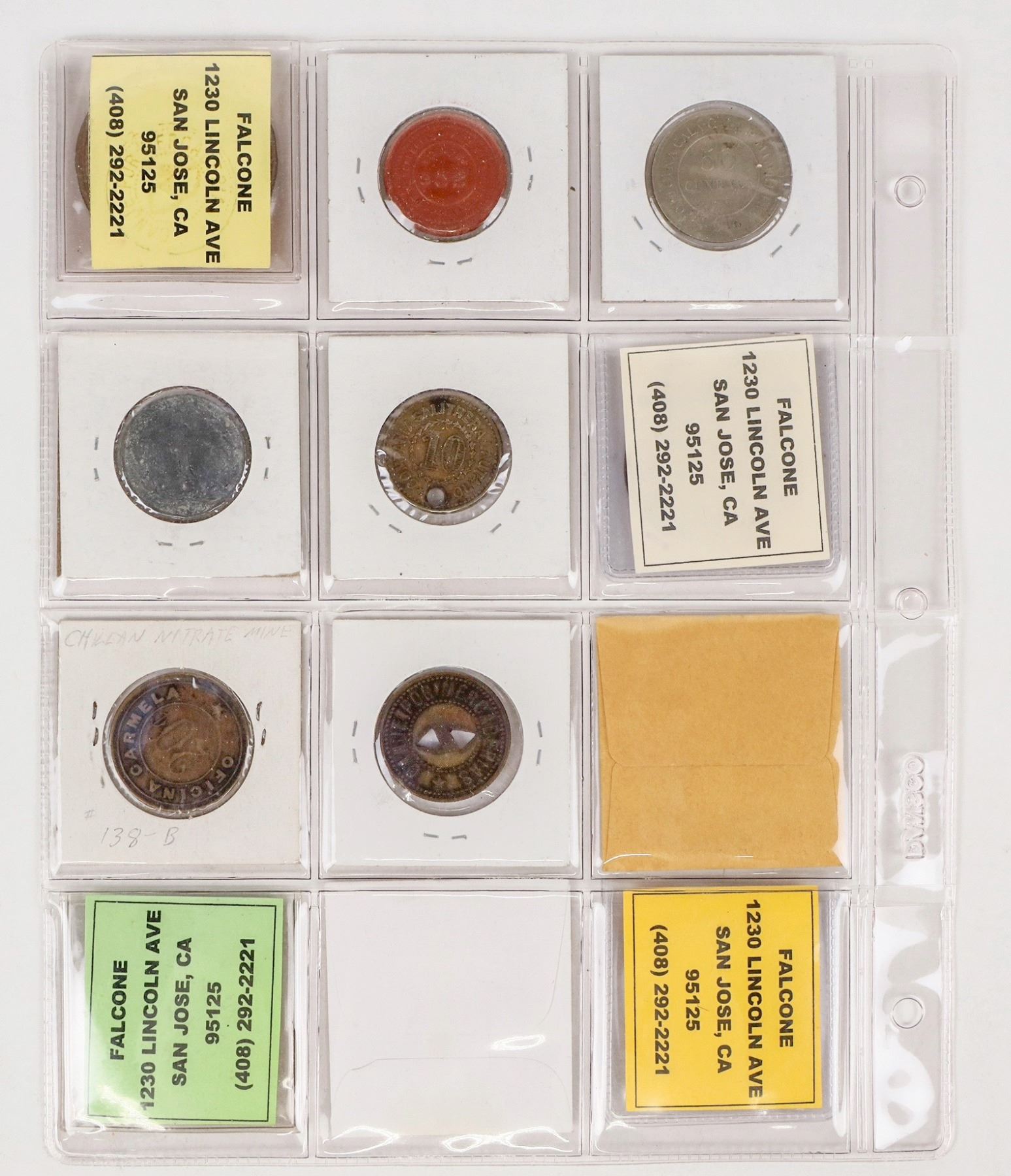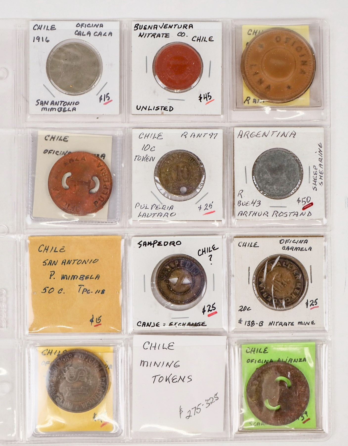 Eleven tokens from Chile mines: 1916 San Antonio Mimbela; Buena Ventura Nitrate Co.; Oficina Lina Angamos $2 (vulcanite); Oficina Alianza; Pulperia Lautaro; San Pedro; Oficina Carmela; Oficina Constancia Jose Devescovi (one peso), others.