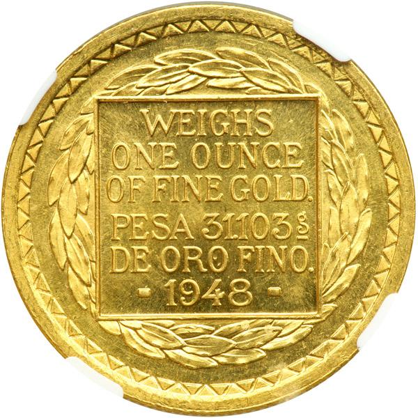 Chile. Onza, 1948-So. KM-X#1. Weight 1.0000 ounce. Mintage 1,950. Female head right. Reverse: Legend on tablet within wreath. NGC graded MS-63.