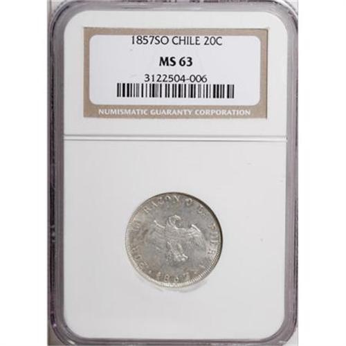 <B>Republic 20 Centavos 1857,</B></I> KM125, MS63 NGC, fully lustrous and very sharply struck on the condor.<BR><I>From the Robert Sayre Collection.</B></I><BR><BR><b>Shipping:</b> Coins & Currency (<a target="_blank" href="http://www.heritageauctions.com/common/shipping.php">view shipping information</a>)