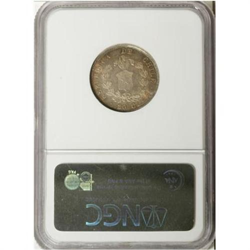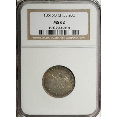 <B>Republic 20 Centavos 1861,</B></I> KM125a, MS62 NGC, pretty gold and russet patina over lustrous surfaces, very scarce grade.<BR><BR><b>Shipping:</b> Coins & Currency (<a target="_blank" href="http://www.heritageauctions.com/common/shipping.php">view shipping information</a>)