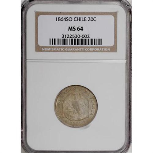 Chile Republic 20 Centavos 1864, KM135, MS64