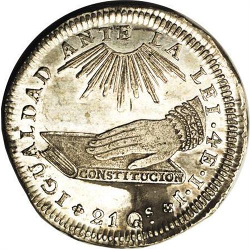 <B>Republic 4 Escudos Trial Strike 1836So-IJ,</B></I> type of KM95 struck in white metal, choice lustrous AU-UNC, sharp details, especially for this metal. A fascinating item and certainly rarely seen in the market.<BR><BR><b>Shipping:</b> Coins & Currency (<a target="_blank" href="http://www.heritageauctions.com/common/shipping.php">view shipping information</a>)