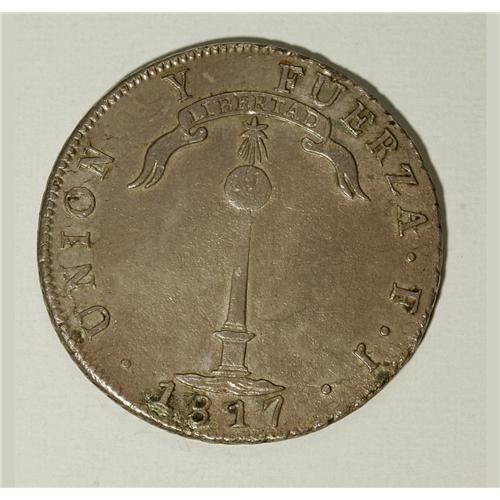 <B>Republic Peso 1817-FJ, </B></I>KM82.2, Y to the left of the pillar, lightly toned XF-AU, slightly porous surface and some minor flaws, but a high grade example of this popular volcano type.<BR><BR><b>Shipping:</b> Coins & Currency (<a target="_blank" href="http://www.heritageauctions.com/common/shipping.php">view shipping information</a>)
