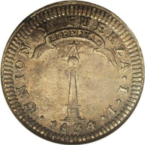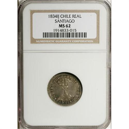 <B>Republic Real 1834-IJ,</B></I> KM91, MS62 NGC, deep original toning, very attractive and rare in mint state.<BR><BR><b>Shipping:</b> Coins & Currency (<a target="_blank" href="http://www.heritageauctions.com/common/shipping.php">view shipping information</a>)