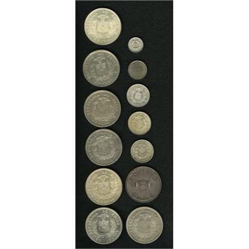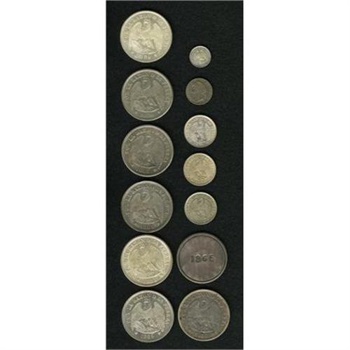 <B>Republic Type & Date Collection,</B></I> KM148 1/2 Centavo 1871 toned AU, scarce, KM137.3 1/2 Decimo 1883/2 cleaned XF, KM138.1 20 Centavos (2), 1874 AU-UNC and 1876 AU, KM138.2 20 Centavos 1880 XF, KM142.1 Peso (7), 1877 VF scratch, 1880 lustrous UNC, 1882 VF-XF large rim bump, 1883 choice AU-UNC, 1885 VF-XF, and 1889 (2), both cleaned XF, and KM4 Copiapo Peso 1865, nice toned XF. <B>Sold as is, no return lot.</B></I><BR><BR><b>Shipping:</b> Coins & Currency (<a target="_blank" href="http://www.heritageauctions.com/common/shipping.php">view shipping information</a>)