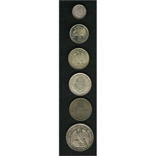 <B>Republic Type Selection,</B></I> KM147 2 Centavos 1873, UNC; KM149 Medio Decimo 1884 mule, UNC; KM138.3 20 Centavos 1891, toned UNC; KM163 40 Centavos 1907, UNC; KM139 50 Centavos 1872, choice UNC; and KM198 2 Escudos 1971, Proof. <B>Sold as is, no return lot.</B></I><BR><I>From the Robert Sayre Collection.</B></I><BR><BR><b>Shipping:</b> Coins & Currency (<a target="_blank" href="http://www.heritageauctions.com/common/shipping.php">view shipping information</a>)