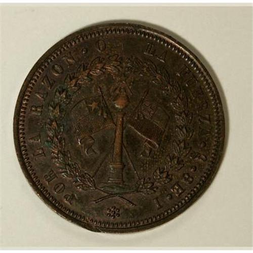 <B>Republic copper Pattern 8 Escudos ND,</B></I> KM-PnA2, nice red and brown UNC with a couple of tiny edge flaws. The surfaces are very attractive and some original luster can be seen in the recessed areas. This type includes the 8 E denomination and So mintmark for Santiago in the legends. Plain edge and struck circa 1818.<BR><BR><b>Shipping:</b> Coins & Currency (<a target="_blank" href="http://www.heritageauctions.com/common/shipping.php">view shipping information</a>)