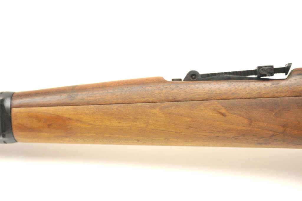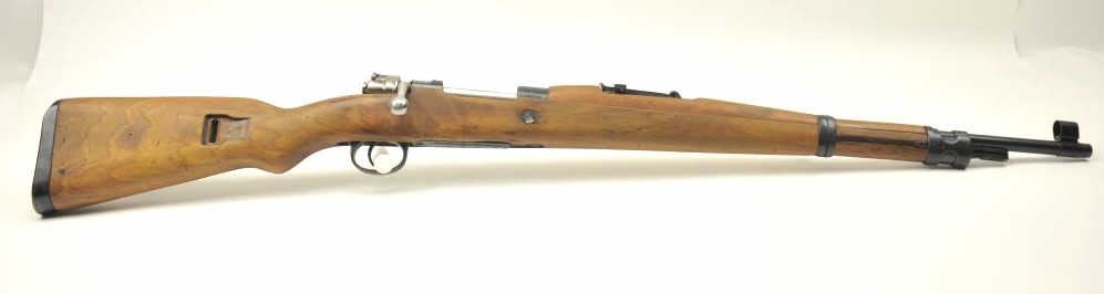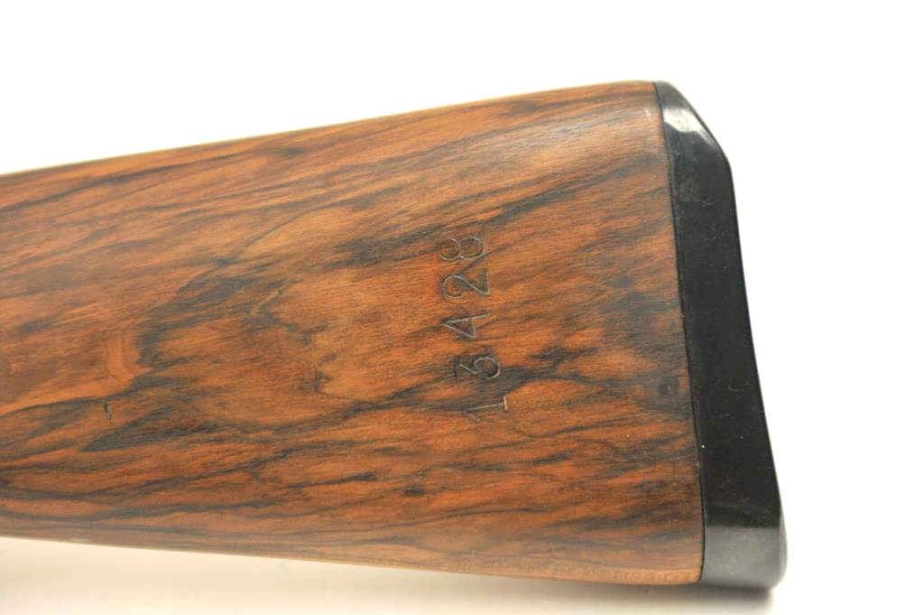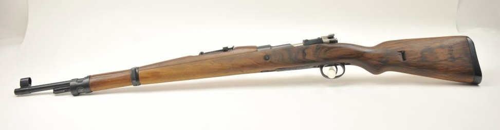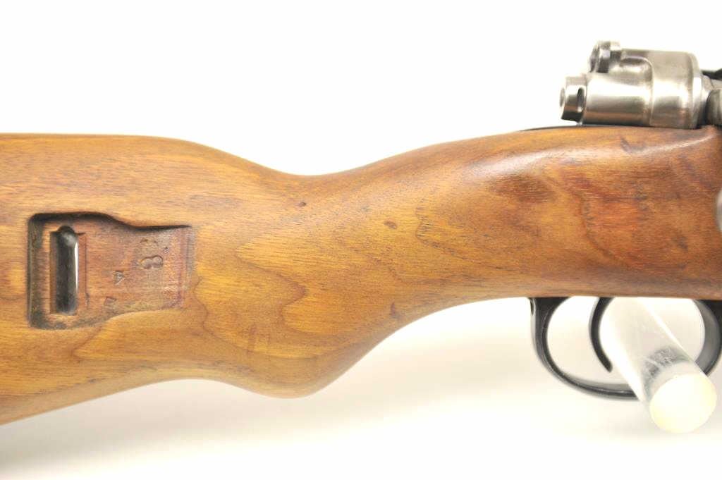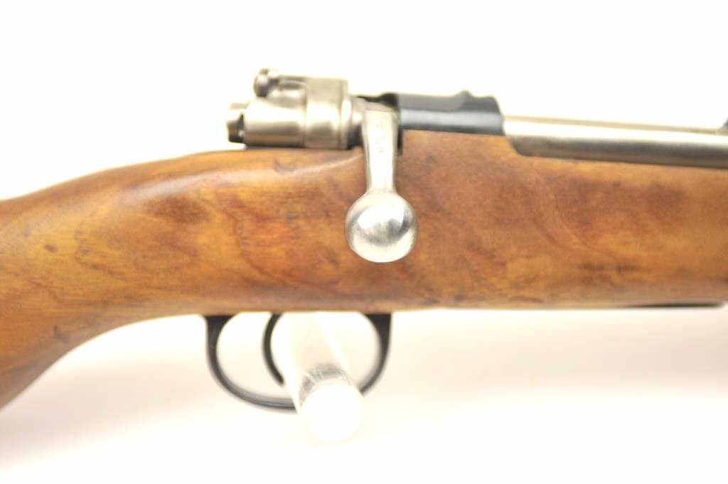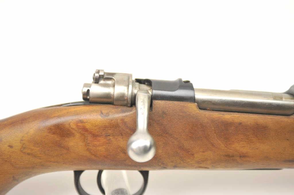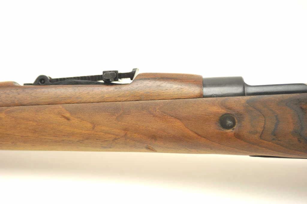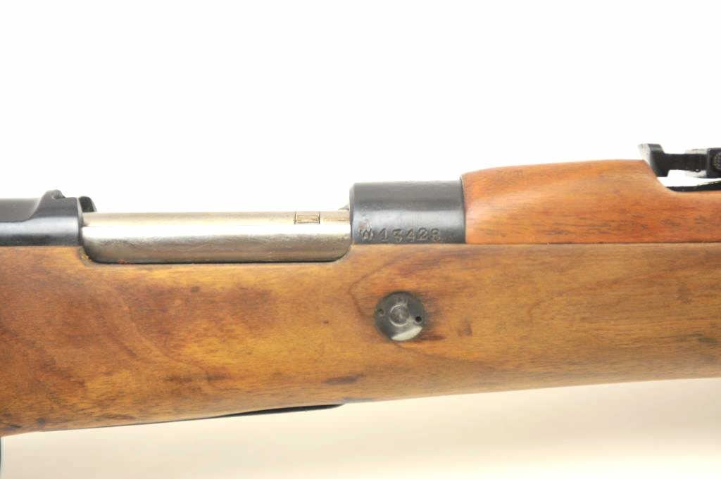 Chilean Mauser Model 98 bolt action rifle, 8 x 57 caliber, Serial #W13428. The rifle is in very good overall condition with a 24” import marked barrel with a hooded front and military tangent style rear sights. Therifle retains a significant amount of the military finish with a crisp Chilean crest on the front ring and all matching visible serial numbers. The smooth wood stock is in very good condition with small mars andhandling marks. The left side of the butt stock has the matching serial numbers. The bore is fair and the action works well. Est.: $250-$500. (C+R).