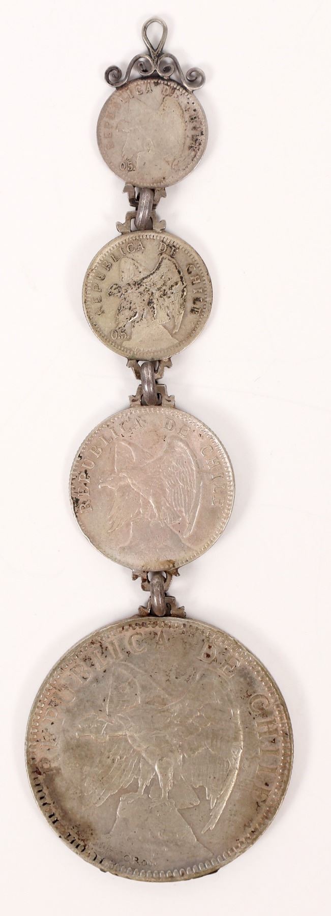 Four silver coin fob with coins from Chile: 1895 one peso; 1895 veinte centavos; 1904 diez centavos; 1901 cinco centavos. 4 1/2 inches long.