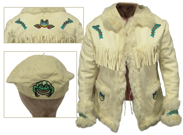 Mid 1900s, Done with rare, beautiful beaded frogs on the hat and jacket plus more owl and waterbug symbols.