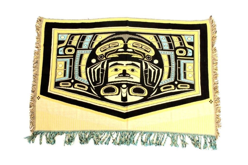 Featured in this lot is this Chilkat, Northwest Coast "Bear Mother" dancing robe. The Bear Mother blanket is decorated with a stylized Chilkat face in the center (Larger), which represents Konankada's wife by the enlarged lower lip that represents a lip labret. Among the peoples of the Northwest Coast was a tradition of highly complex and innovative weaving called the Chilkat Blanket. The condition of this dancing blanket is good, with no obvious signs of damage. The measurements of this dancing blanket are 69" x 48".