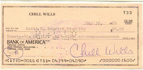 CHILL WILLS. DS. 1pp. 6" x 2 3/4". n.p. May 31, 1976. A check signed by Chill Wills in blue ink. It is in very fine condition and light cancellation holes do not touch the signature.