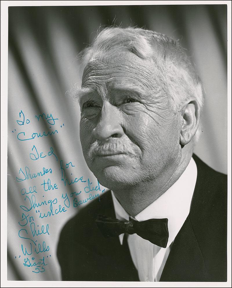 Vintage glossy 8 x 10 photo of Wills in a bow tie, signed and inscribed in fountain pen “To my ‘cousin’ Ted, Thanks for all the nice things you did for ‘Uncle Bawley.’ Chill Wills ‘Giant’ ‘55.” In fine condition, with trivial binder dings to left edge, and a few scattered light surface marks. Ted Ashton, a Princeton graduate, began his motion picture career in 1947 in the publicity department at Warner Brothers. He soon became a unit publicist on many of the studios most successful films for the next 18 years. Among his many credits were Giant, Mister Roberts, Auntie Mame, East of Eden, Calamity Jane, The Green Berets, and Bound for Glory. Pre-certified PSA/DNA and RRAuction COA.