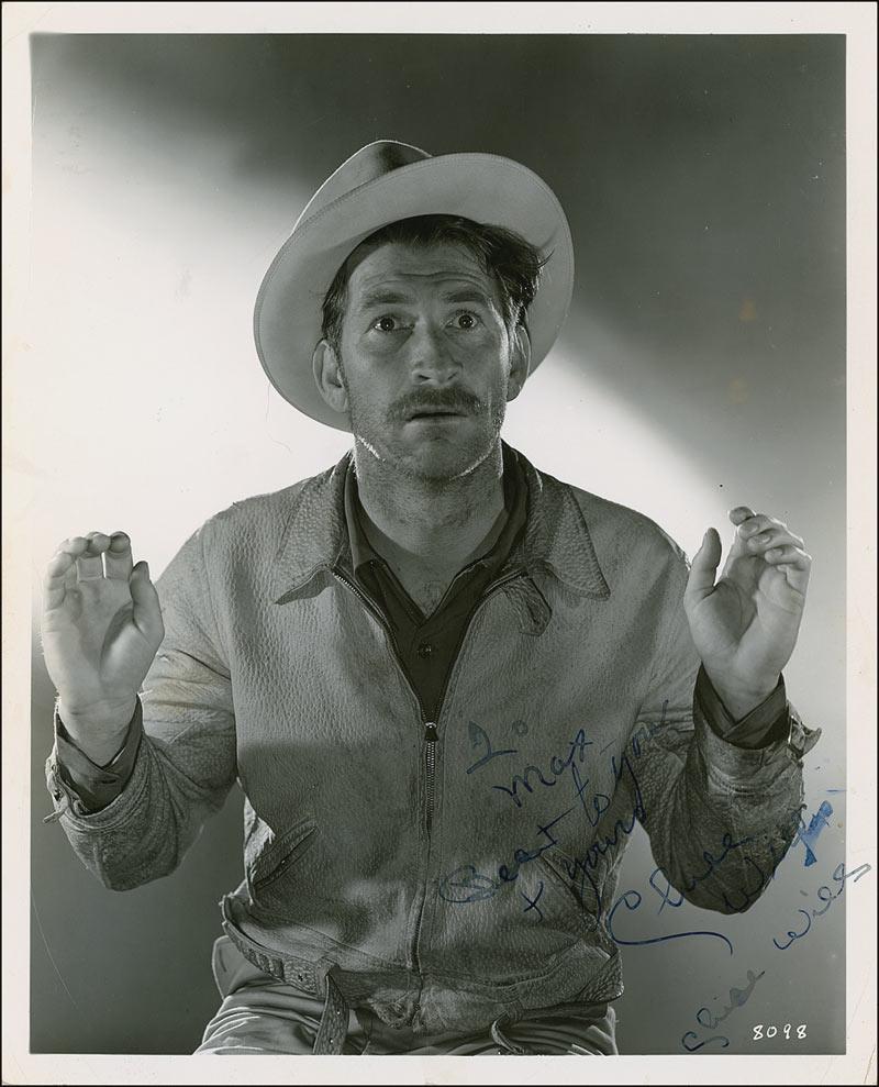 Vintage glossy 8 x 10 photo of Wills as he appeared in Boom Town, signed and inscribed in fountain pen “To Max, Best to you & yours, Chill Wills,” and signing again under his first signature. In very good condition, with scattered creases and surface marks, a bit of irregular ink adhesion to inscription, and some light brushing to both signatures. Pre-certified PSA/DNA and RRAuction COA.