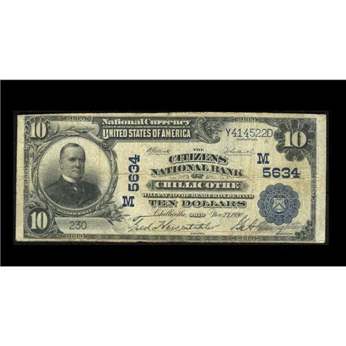 <B>Chillicothe, OH</B></I> - $10 1902 Plain Back Fr. 633 <B>The Citizens NB</B></I> Ch. # (M)5634<BR>The stamped signatures remain and the paper is intact save for a rough bottom margin. <B>Very Good-Fine.</B></I>