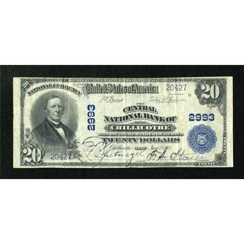 <B>Chillicothe, OH</B></I> - $20 1902 Plain Back Fr. 650 <B>The Central NB</B></I> Ch. # 2993<BR> Only a dozen large size have been counted thus far on this Ross County bank that closed in 1934. That number includes this pleasing <B>Very Fine</B></I> example that has retained its signatures. A few minor ink spots are noticed on the back but they do not interfere at all with the attractiveness of this note.<BR><BR><b>Shipping:</b> Coins & Currency (<a target="_blank" href="http://www.heritageauctions.com/common/shipping.php">view shipping information</a>)