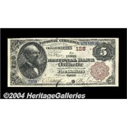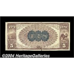 Chillicothe, OH - $5 1882 Brown Back Fr. 466 The First NB Ch. # 128A beautifully margined $5 Brown Back which has all of the attributes any collector could desire, including vivid colors, bold pen signatures, and a classically ornate title layout of the kind found only on this denomination of Brown Backs. Gem Crisp Uncirculated. <BR><BR><B>Important notice:</B> Heritage usually auctions material at the rate of 200-250 lots per hour. On some occasions eBay Live bid software or the Internet may not be able to keep up with the pace of the auction. We recommend placing a realistic absentee bid now as insurance to avoid disappointment. Occasionally the auctioneer may eliminate or reject an eBay Live bid, and the auctioneer may also reopen a lot after the close of the eBay live bidding (usually because we missed an audience bid), and may reject your bid even if it shows you as the winning bidder. By bidding via eBay Live, you agree that Heritage may award the lot to another bidder at its sole discretion under the circumstances described above or any other reasonable circumstances. Since eBay bids are not shown to us until we open the lot on the floor, we treat those bids just like floor bids. In most cases the floor responds before the eBay bid is presented to us, due to Internet lag time, so for consistency we have made it a policy that floor bids are always considered first over tie eBay live bids. Also please note that all Heritage lots purchased through eBay Live carry a 20% Buyer's Premium. Please make sure you read the Terms and Conditions before you bid. <BR><BR><B>IMPORTANT ANNOUNCEMENT ABOUT RESERVES:</B> Heritage now divulges all reserves on its web site 7 days before every auction. If you want to know whether the reserve on this lot has been met, and if not, what the reserve amount is, please visit this lot page on the HeritageCoin.com web site, or email: bid@HeritageGalleries.com