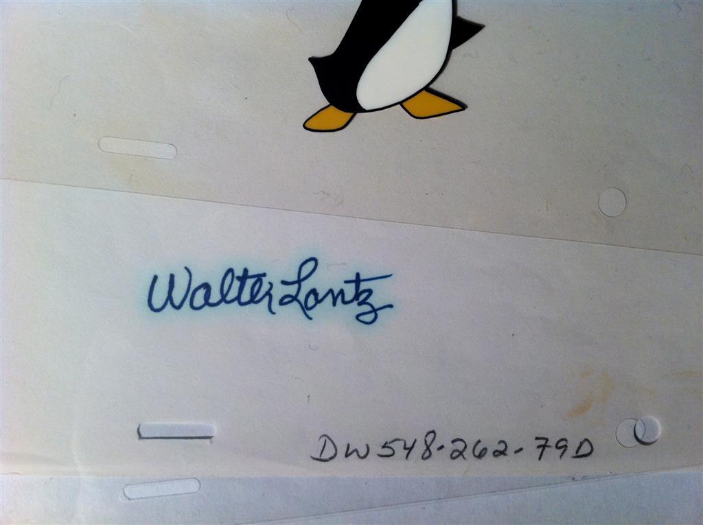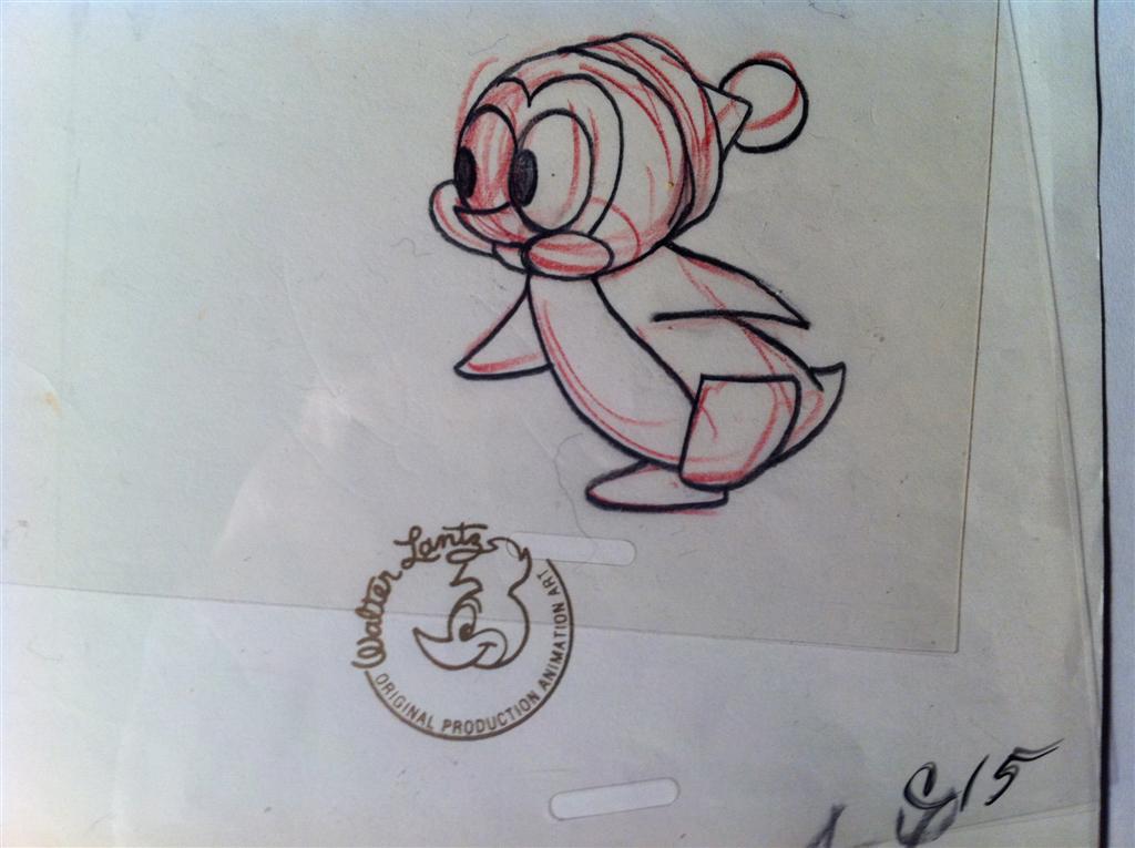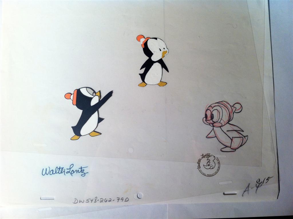 Chilly Willy "Chilly's Cold War" Animation Cels and Drawing - Two original animation cels of Chilly Willy from the 1970 short "Chilly's Cold War" and one hand drawn sketch on animation paper signed by Walter Lantz with seal from Walter Lantz Productions. Includes documentation. 12.5" x 10.5"