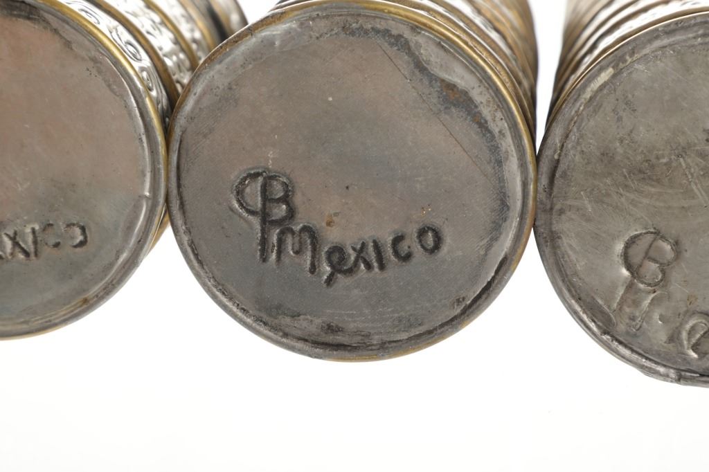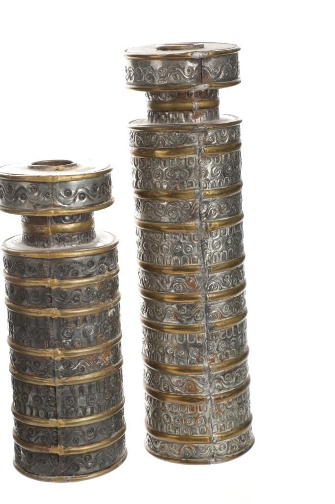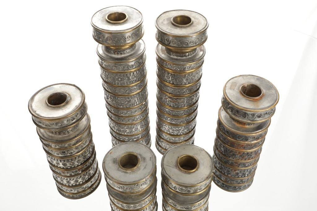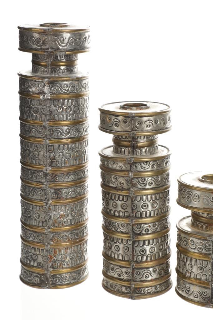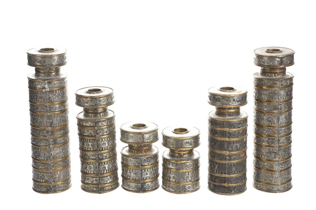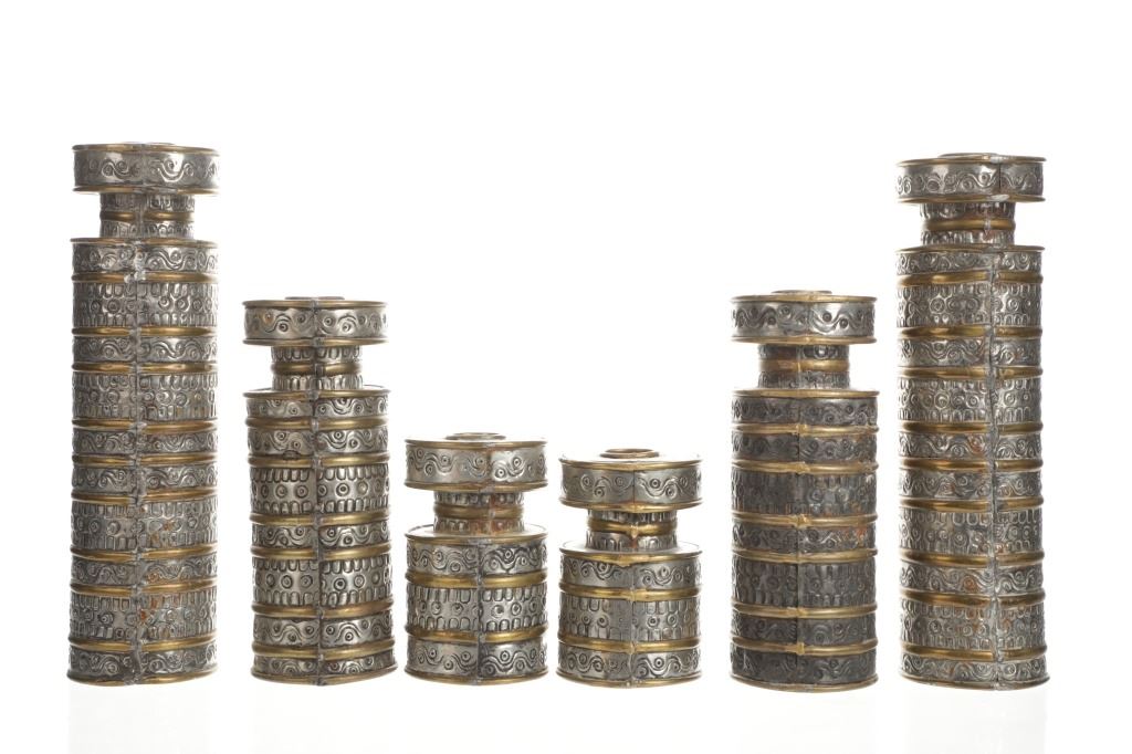 Featured in this lot is this collection of stamped cylindrical candle stick holders marked CB Mexico for Chilo Botes of San Miguel de allende which consists of artists Cecilio Hernández, Eleazar and Enrique Badillo and Artes de Mexico on the Calzada de la Aurora on the bottoms of the candle stick holders. There are six candle stick holders in this collection that all show the same pattern of stamped ornate decoration in a cylindrical design. Chilo Botes as many metal workers in the area of San Miguel de Allende work in this area and have been producing tin works for 100's of years. The condition of these candle stick holders is fair with oxidation adorning them in places and shows some wax still in the holder placement but otherwise is in fair overall condition. The measurements of these candle stick holders range from 11 3/4" x 3 1/4" x 3 1/4" to 5 1/4" x 3 3/8" x 3 3/8".