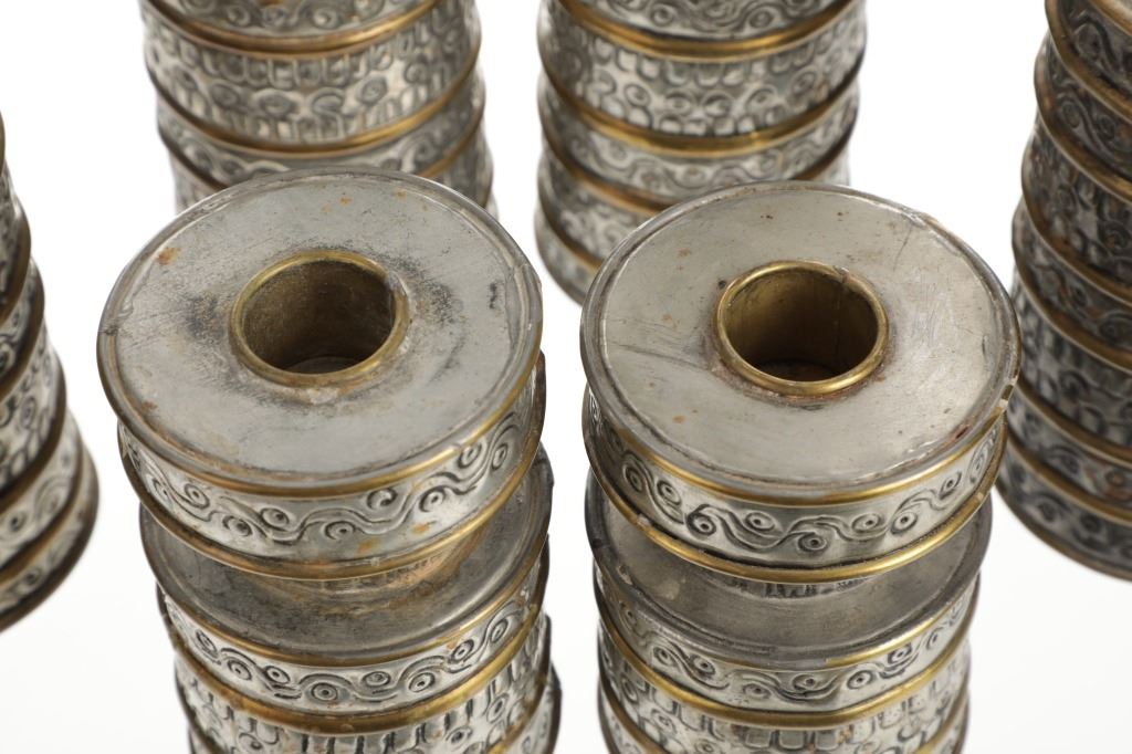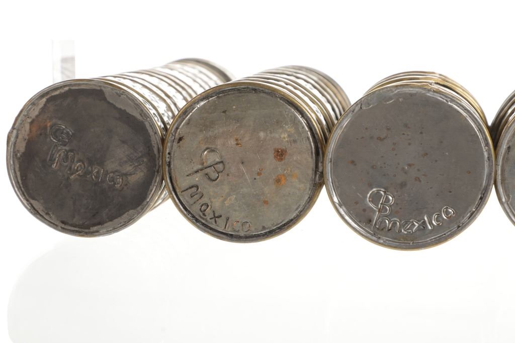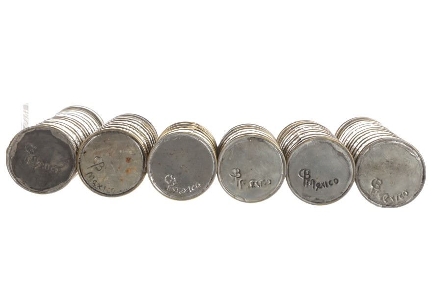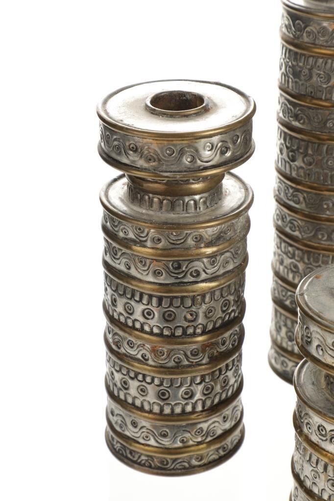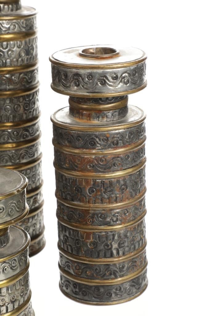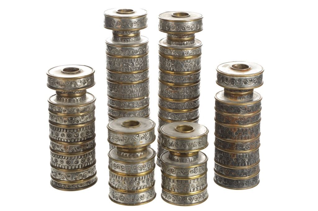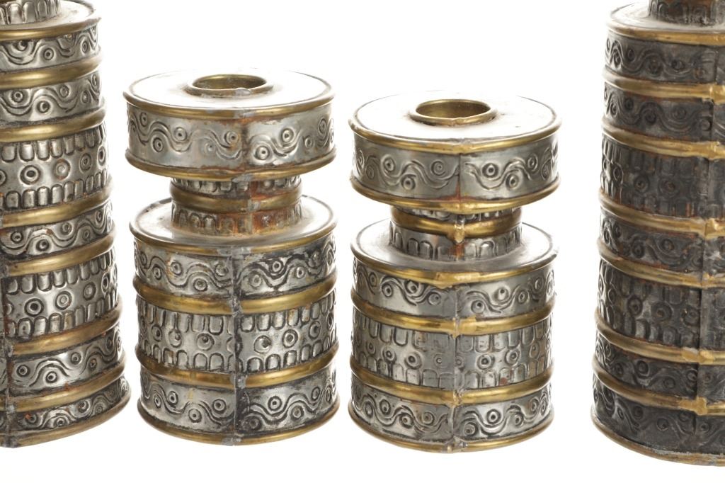 Featured in this lot is this collection of stamped cylindrical candle stick holders marked CB Mexico for Chilo Botes of San Miguel de allende which consists of artists Cecilio Hernández, Eleazar and Enrique Badillo and Artes de Mexico on the Calzada de la Aurora on the bottoms of the candle stick holders. There are six candle stick holders in this collection that all show the same pattern of stamped ornate decoration in a cylindrical design. Chilo Botes as many metal workers in the area of San Miguel de Allende work in this area and have been producing tin works for 100's of years. The condition of these candle stick holders is fair with oxidation adorning them in places and shows some wax still in the holder placement but otherwise is in fair overall condition. The measurements of these candle stick holders range from 11 3/4" x 3 1/4" x 3 1/4" to 5 1/4" x 3 3/8" x 3 3/8".