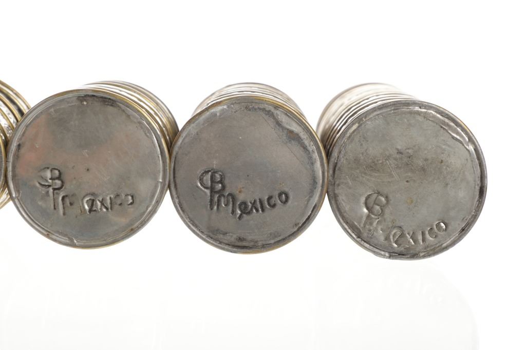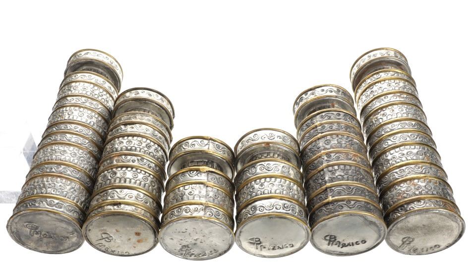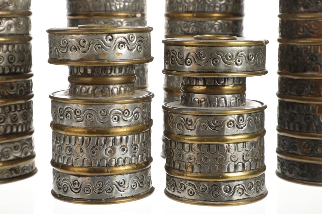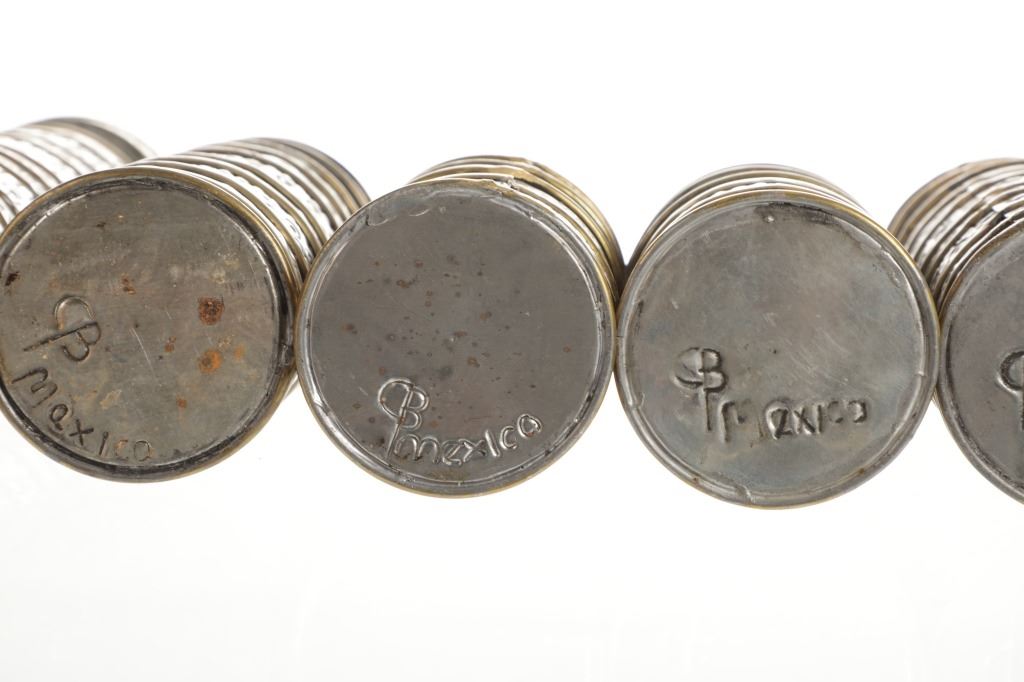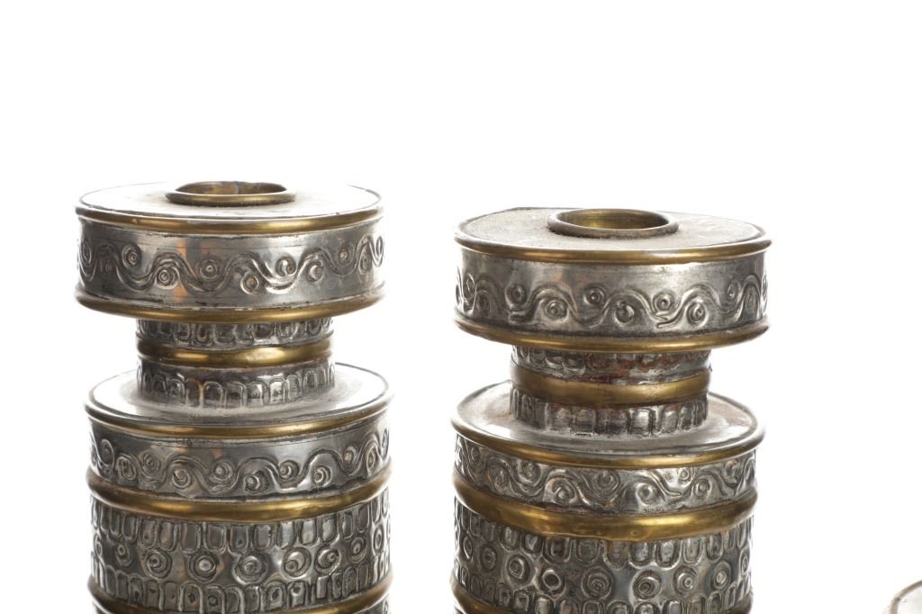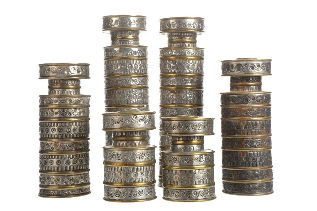 Featured in this lot is this collection of stamped cylindrical candle stick holders marked CB Mexico for Chilo Botes of San Miguel de allende which consists of artists Cecilio Hernández, Eleazar and Enrique Badillo and Artes de Mexico on the Calzada de la Aurora on the bottoms of the candle stick holders. There are six candle stick holders in this collection that all show the same pattern of stamped ornate decoration in a cylindrical design. Chilo Botes as many metal workers in the area of San Miguel de Allende work in this area and have been producing tin works for 100's of years. The condition of these candle stick holders is fair with oxidation adorning them in places and shows some wax still in the holder placement but otherwise is in fair overall condition. The measurements of these candle stick holders range from 11 3/4" x 3 1/4" x 3 1/4" to 5 1/4" x 3 3/8" x 3 3/8".