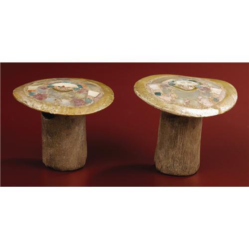 <B>Pair of Earspools</B></I><BR>Chimú<BR>A.D. 1100 - 1400<BR>Wood, shell, green stone<BR>Weight 50 grams<BR>Diameter 2 1/2 in.<BR><BR>A standard North Coast motif from Moche times onward for a thousand years presents a standing frontal figure holding objects to either side and wearing a large crescent-shaped headdress. In these earspools each figure holds a pair of what appear to be tall cups with white upper sections, orange central areas, and blue-green lower parts.The faces have noses carved in bas-relief. This feature combines with blue-green eyes to impart a surprising degree of animation in such small faces. There is some cracking and minor loss in the wood. The mosaic is in good condition, with minor adhesive losses and surface abrasions.<BR><BR>Provenance<BR>Bonhams & Butterfields, San Francisco: sale 737E, 9 June 2003, lot 5110 (there mounted with a silver-repoussé crown and breastplate, no longer a part of the present lot)<BR><BR>