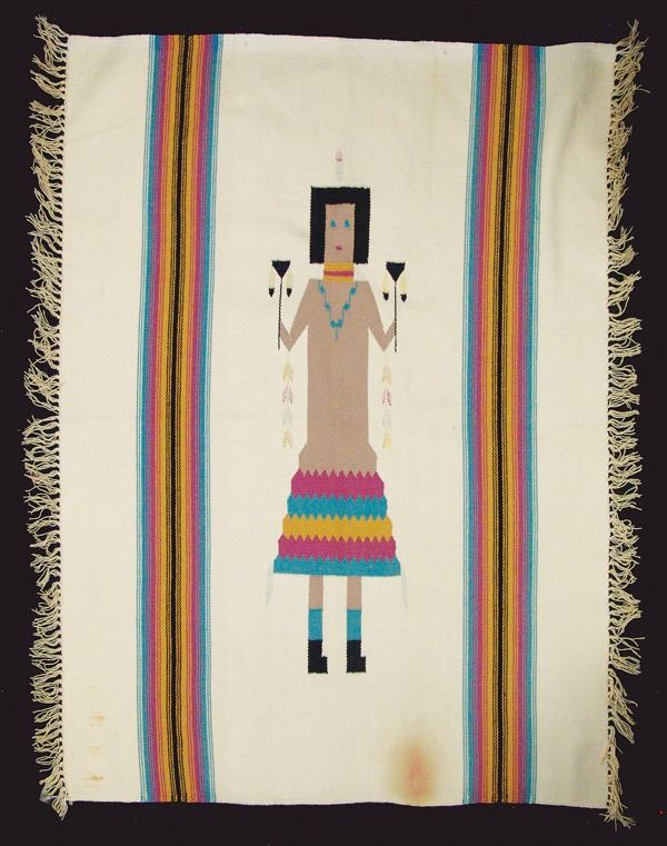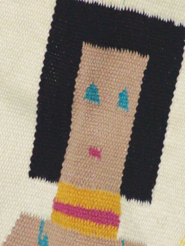 Vintage, fine weave blanket with colorful, single Yei figure, traditional wavy lines, and fringed ends. Good condition, light stain near one end.Ca. 1980s53" x 38"