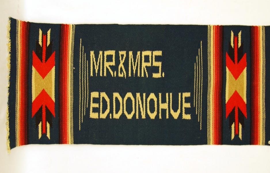 Chimayo Throw, Mr. & Mrs. Ed. Donohue woven into rug, measures approx. 14.25" x 33". SHI $20.