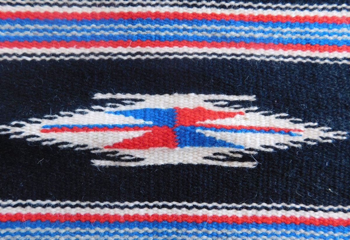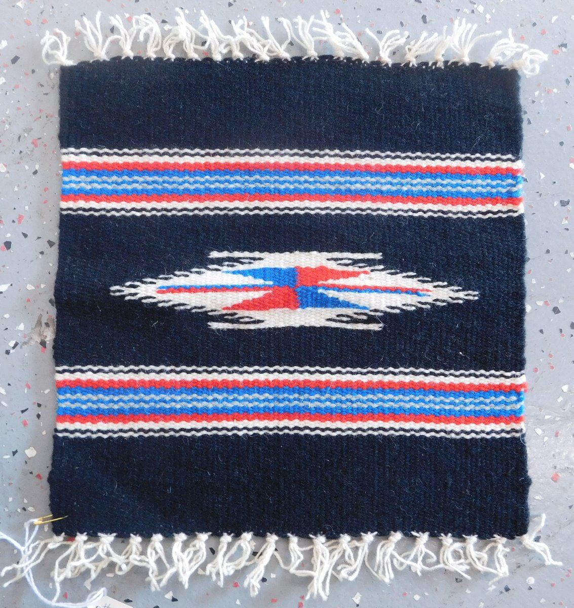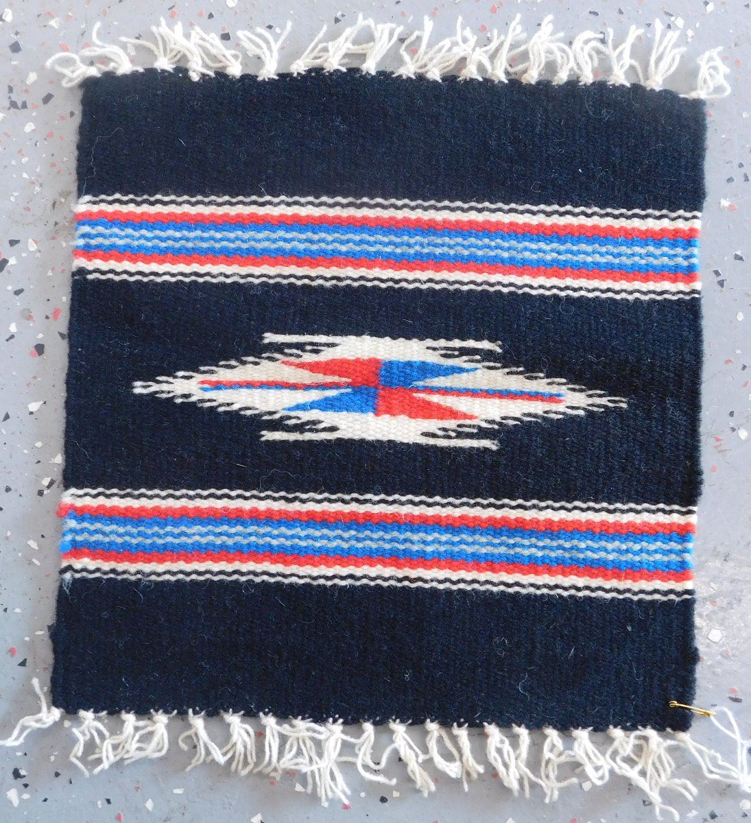 Chimayo Weaving, circa 1980s. Made of wool and dye, the item measures 12" x 10" w/fringe. New Mexico. Red, white, blue and black colors with some grey. Condition: Very nice, see images. Shipping: $15.50 w/insurance and signature.