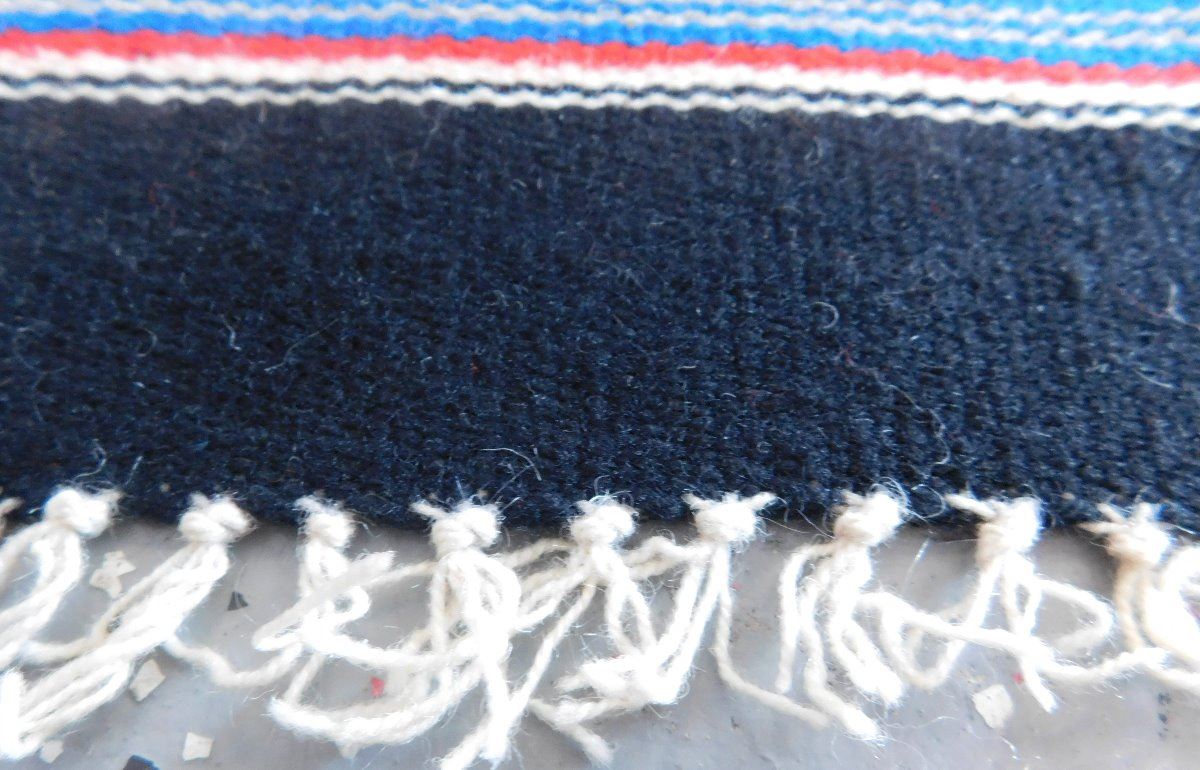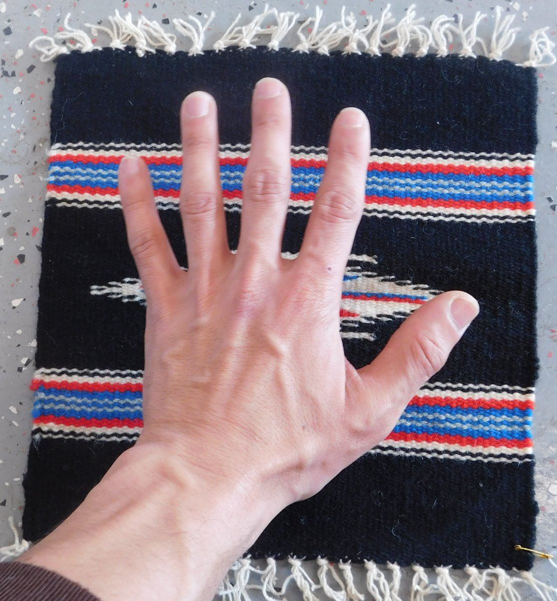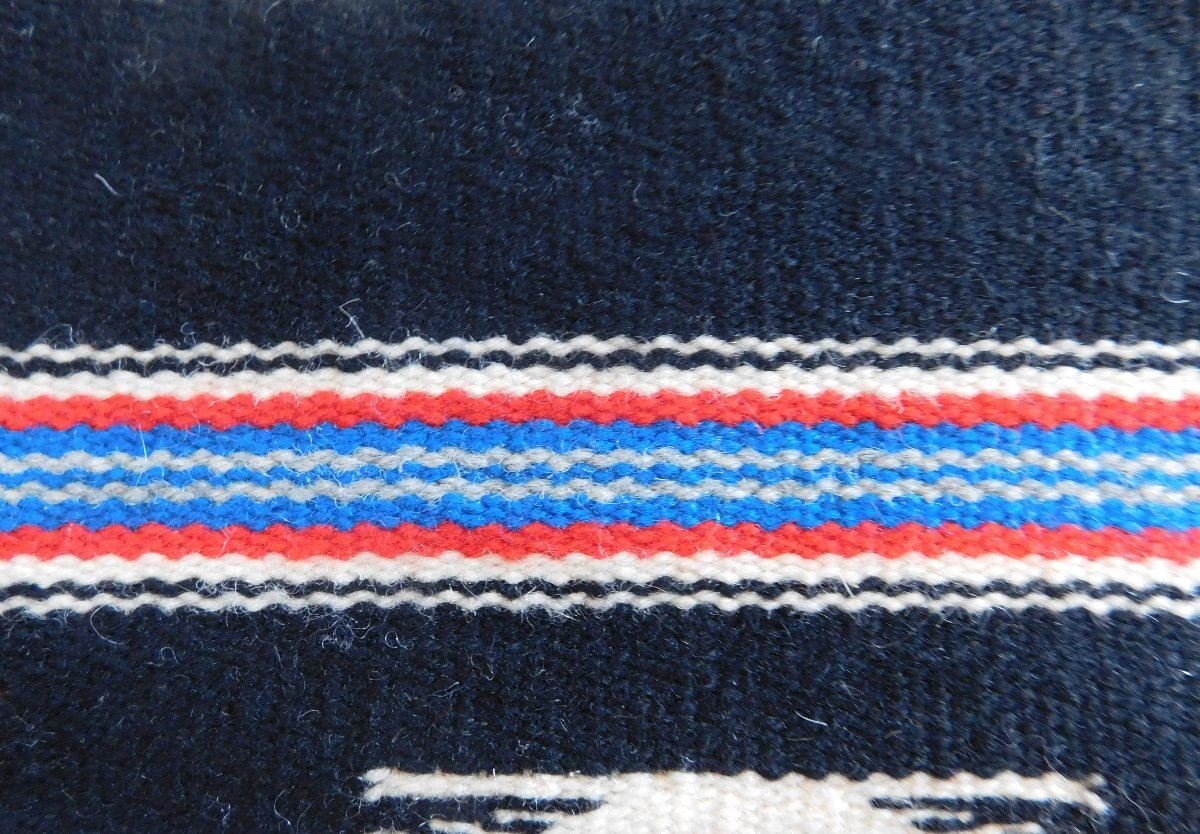 Chimayo Weaving, circa 1980s. Made of wool and dye, the item measures 12" x 10" w/fringe. New Mexico. Red, white, blue and black colors with some grey. Condition: Very nice, see images. Shipping: $15.50 w/insurance and signature.