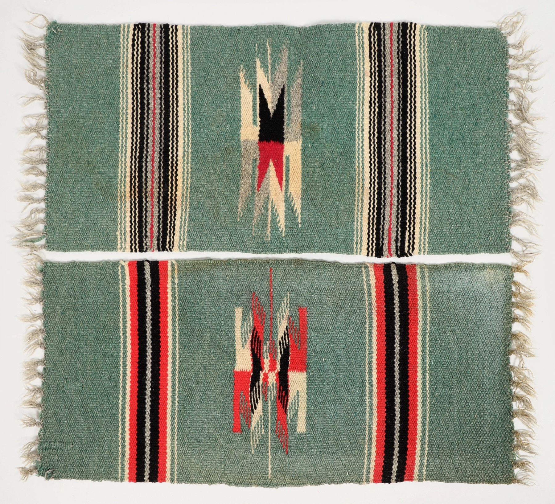 Chimayo weavings, likely wool or other natural fiber, matching pair. Both weavings measure about 19x9" without frill ends. Stain might be removable with dry cleaning. Good condition aside from stains, see photo.