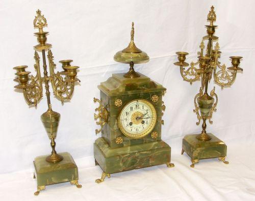 Pendule de cheminée avec chandeliers en laiton et marbre vert, mouvement de Paris, sonne les heures et les demies, époque Napoléon III