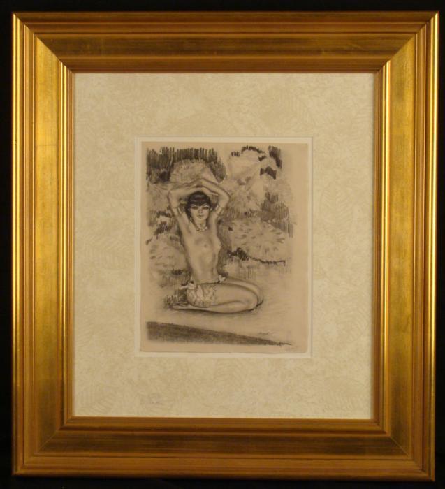 This is an original etching by noted French artist, illustrator and editor Edouard Chimot. This image portrays a tropical setting, with a woman giving a rather sultry pose.Artist: Edouard ChimotSigned by the artist in pencil, lower rightMedium: Etching on paperImage size: 8 5/8" x 11" Framing: Matted in gold tone leaf pattern to match the tropical theme, in gold painted wood frameFrame size: 22 1/4" x 24 1/2"Condition: Very goodChimot is famous for his 1920's illustrations, and this etching has an exotic and erotic flair that makes it even more desireable. Biography
