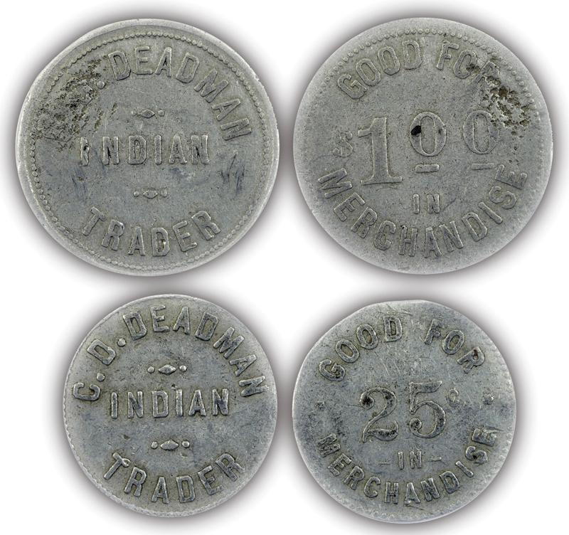 Two tokens: Obverse: C.D. Deadman/ Indian / Trader; Reverse: Good for / 25 / in / merchandise; Good for / $1.00 / in / merchandise. Fair condition with some damage to the larger token.
