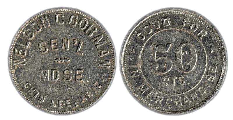 Obverse: Nelson C. Gorman / Gen'l / Mdse / Chin Lee, Ariz.; reverse: Good for / 50 / cts / in merchandise. AL, 29mm. Extremely fine condition, R7.