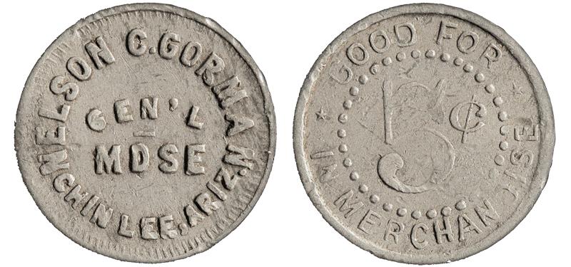 Obverse: Nelson C. Gorman / Gen'l / MDSE / Chin Lee, Ariz. Reverse: Good for / 5c / In Merchandise. AL, 19mm. R7. Obverse very good, reverse fair.
