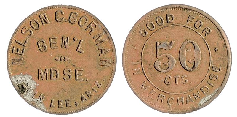 Obverse: Nelson C. Gorman / Gen'l / Mdse / Chin Lee, Ariz.; reverse: Good for / 50 / cts / in merchandise. Brass, 29mm. Very good condition, discoloration lower left obverse.