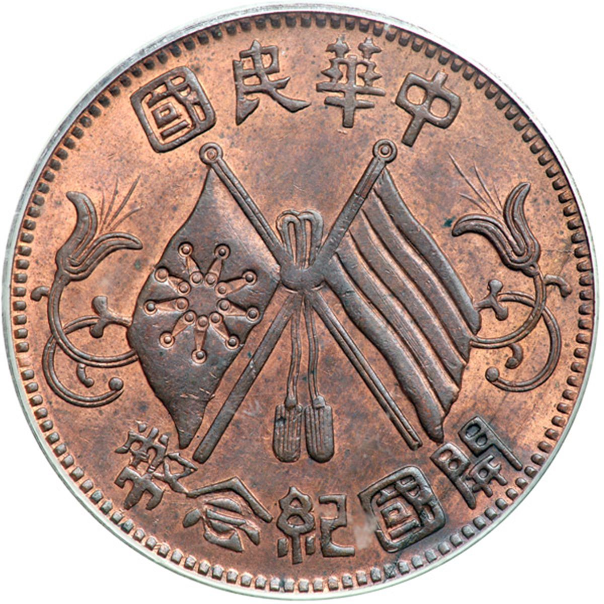 China. 10 Cash, ND (1912). Y-301. Republic. Crossed flags. PCGS graded MS-64 Red & Brown.