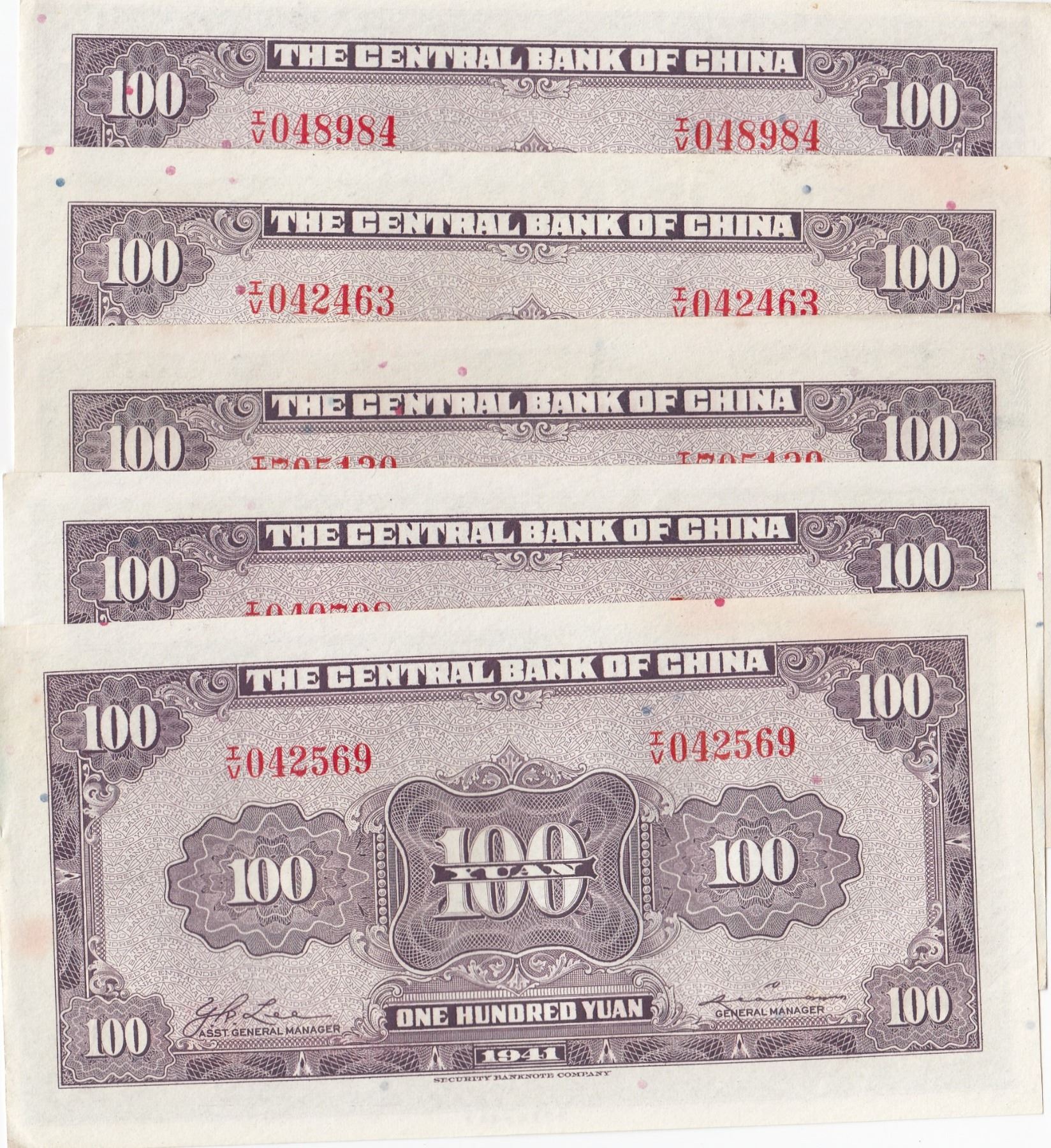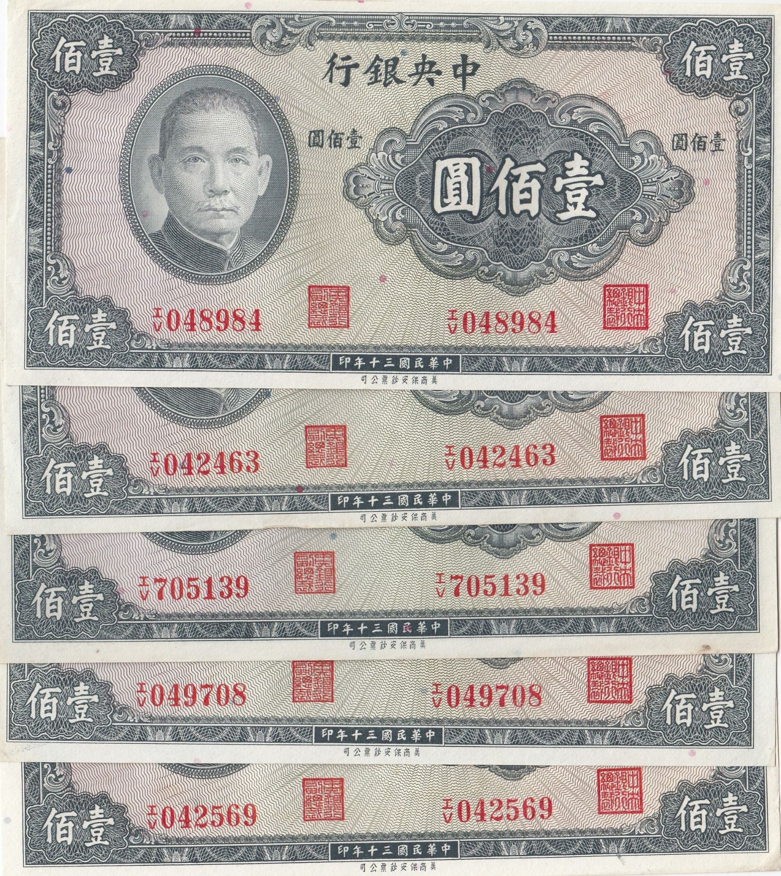 China, 100 Yuan, 1941, AUNC /UNC, p243a, (Total 5 banknotes)br/Three of the banknotes are UNC condition, the other two do not show any signs of folding, but the edges are broken in hiding conditions.