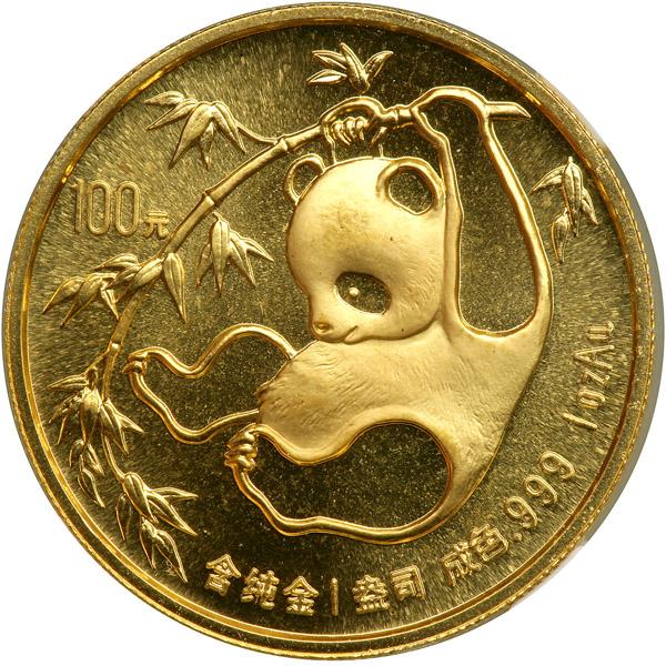 China. 100 Yuan, 1985. KM-118. Weight 0.9999 ounce. Temple of Heaven. Reverse: Panda hanging from branch. NGC graded MS-69.