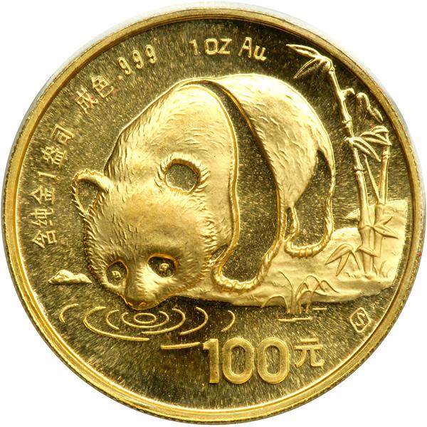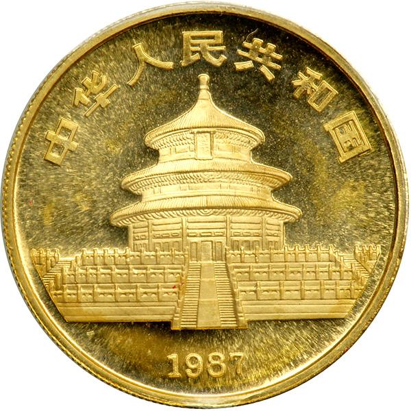 China. 100 Yuan, 1987. KM-166. Weight 0.9999 ounce. Temple of Heaven. Reverse: Panda drinking at stream. Choice Brilliant Uncirculated.