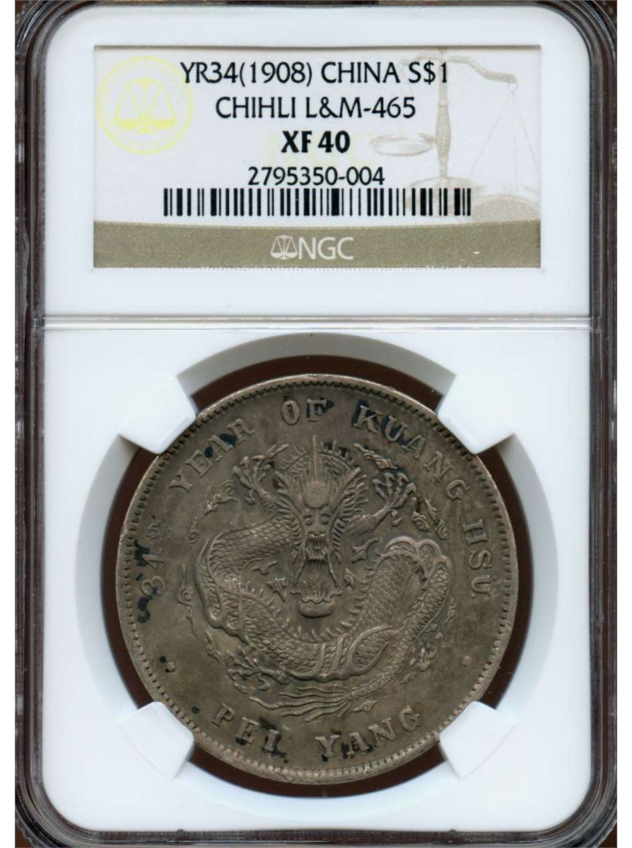 China 1908, Chihli, Silver Dollar, Darker toning but nice details and no damage, L&M 465, NGC certified XF-40